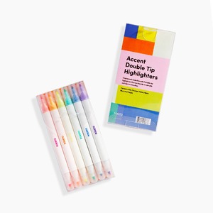 Emphasize & underline with 6 double-tip highlighters that are fine-tip on one side and thick on the other. Comes in Pink, Orange, Yellow, Aqua, Blue, and Purple. Water-based ink.