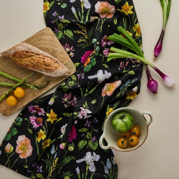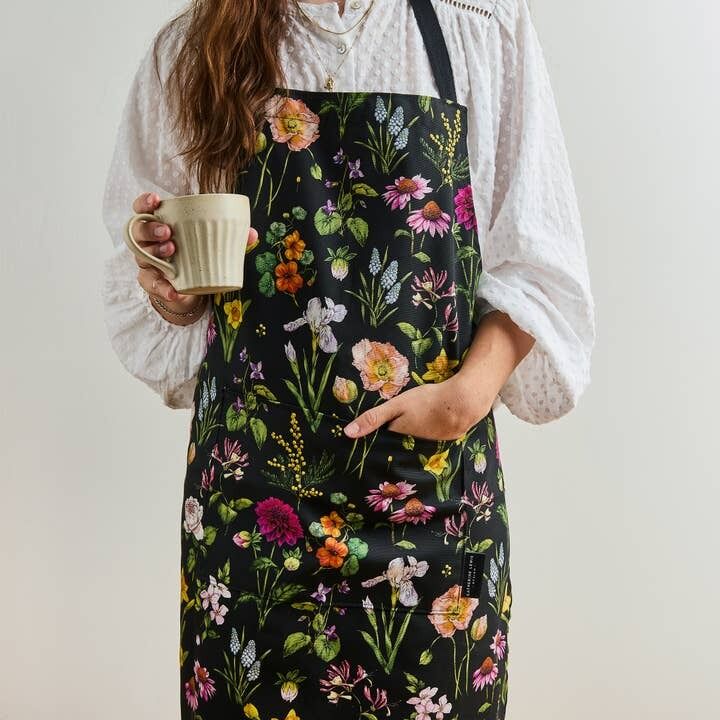 Luxury 'Bountiful Blooms' Apron on an black base, 100% Organic Cotton.
