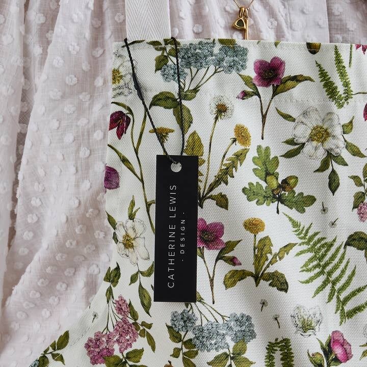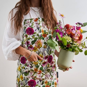 Luxury 'Bountiful Blooms' Apron on an ivory base, 100% Organic Cotton.