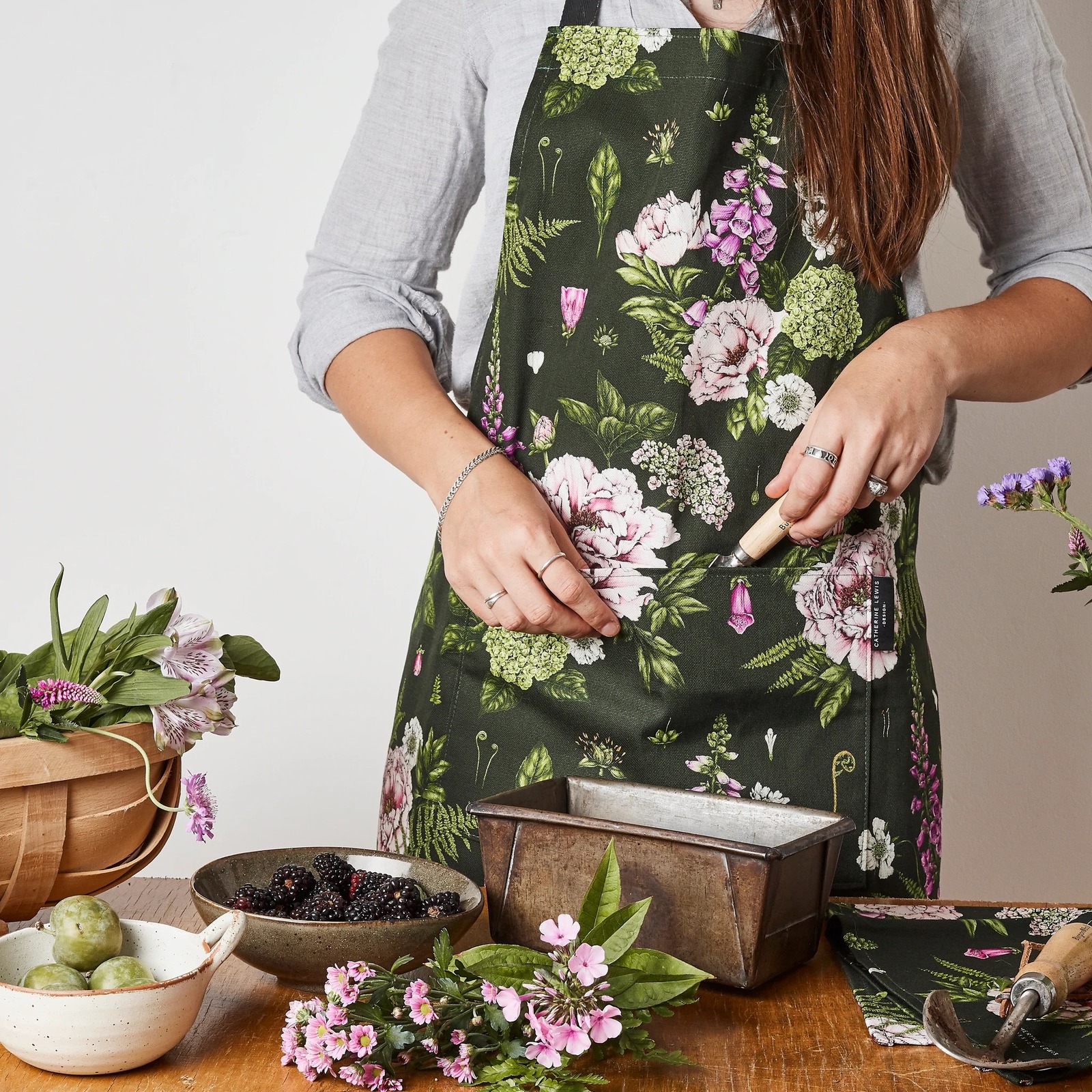 The Summer Garden Apron on a dark green base. Printed on a high quality 100% Organic Cotton.