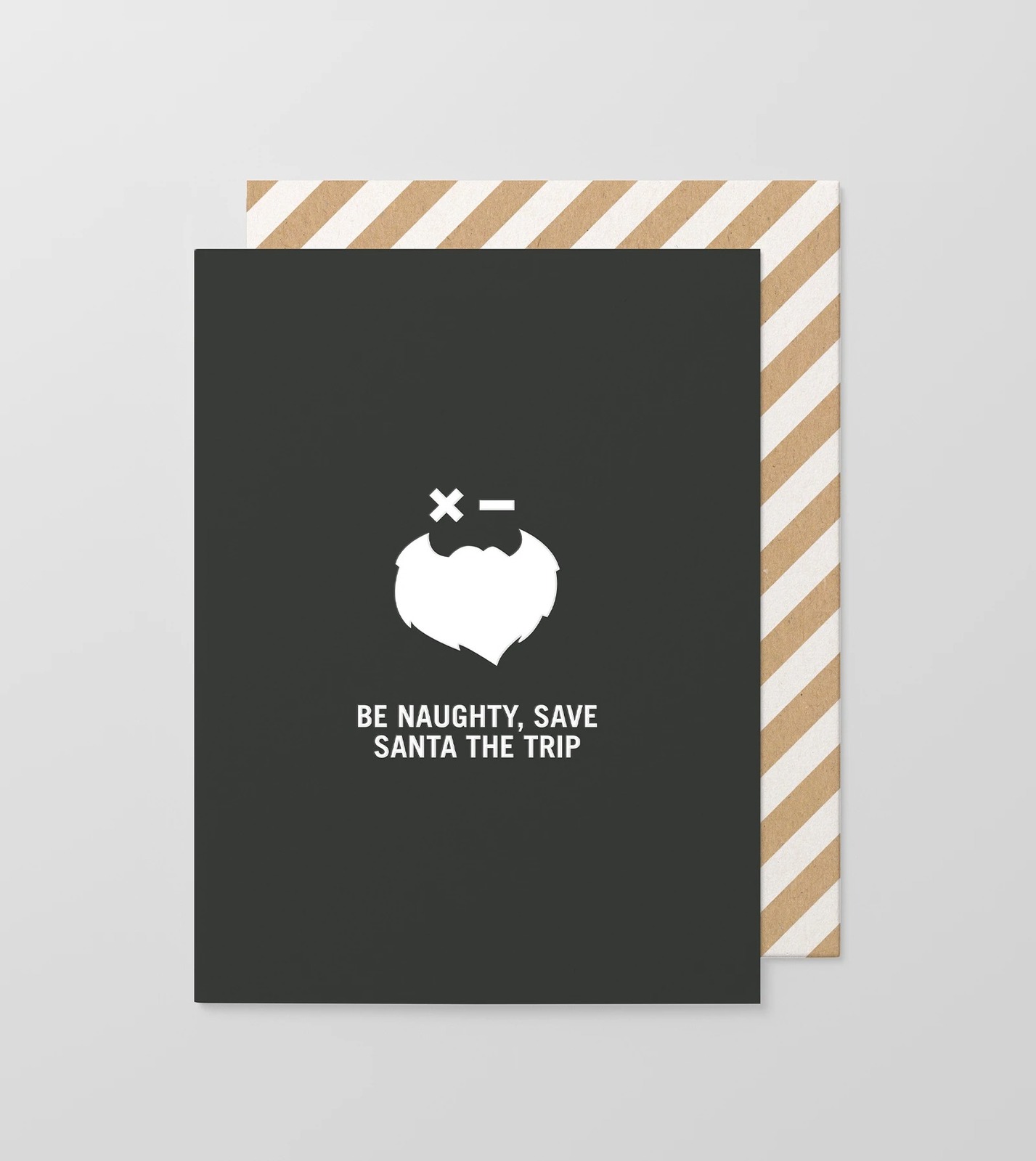 Who knew Santa had a wild side? Spread Christmas cheer with our our fun Be Naughty greeting card. Finishes: embossed and white foil. Stock: 350gsm uncoated recycled paper. Inside: Blank. Envelope: White stripe on 100% recycled uncoated kraft paper