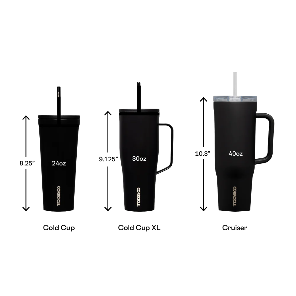 Let the joyrides commence. Cruiser, Corkcicles' largest straw cup to date, keeps 40 oz of your favorite beverage cold for up to 20 hours, allowing you to enjoy everyday adventures without giving your hydration needs a second thought. It features an exclusive dual-function sip + straw spill-proof lid, a comfy soft-grip handle, and a stay-put silicone bottom to keep it upright no matter your destination or how many stops you take on the way.