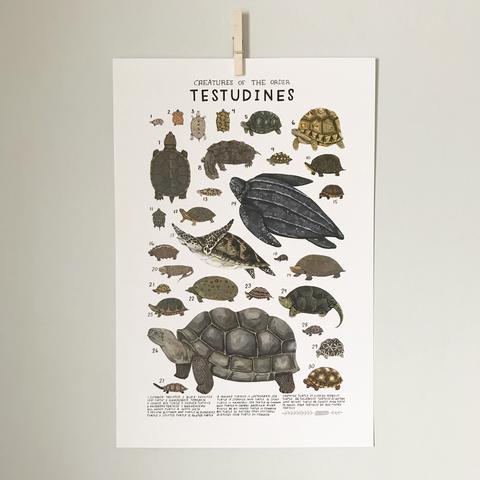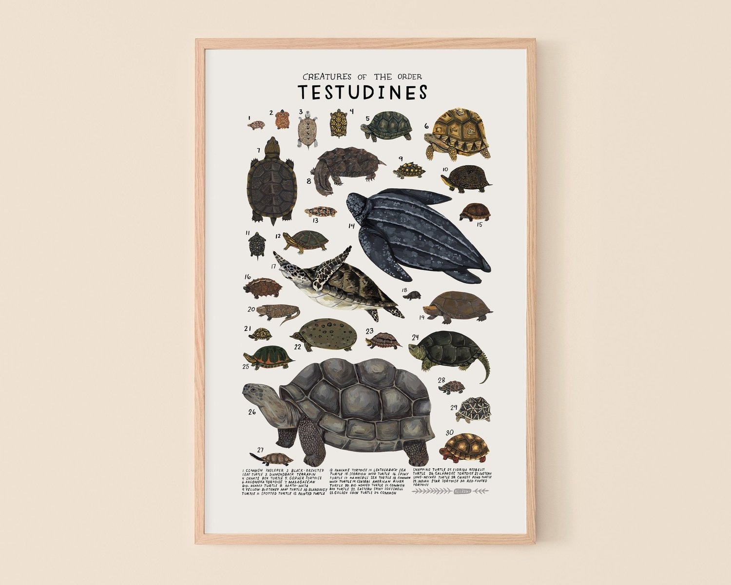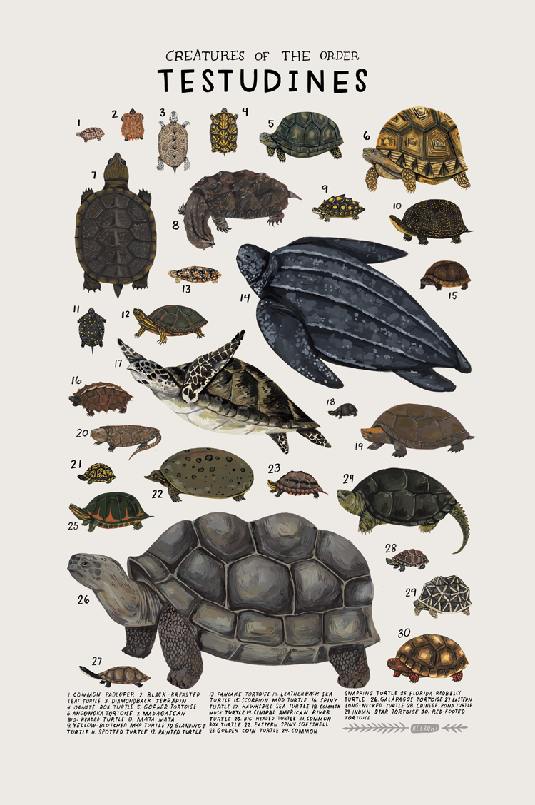 This poster chronicles 30 turtles, tortoises, and terrapins from the taxonomic order Testudines. Printed in Minneapolis on acid free 80# Mohawk Superfine cover. Art print of an illustration by Kelsey Oseid.