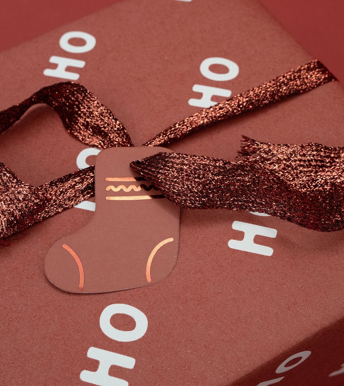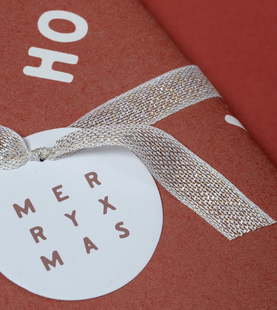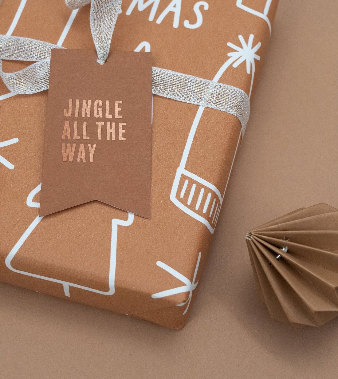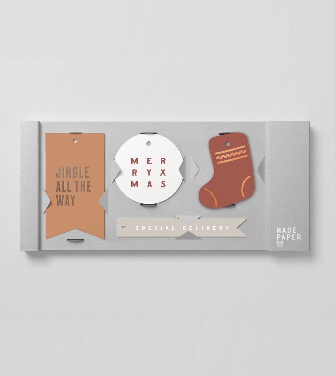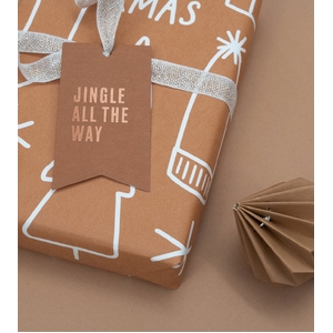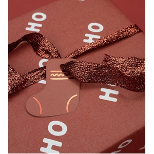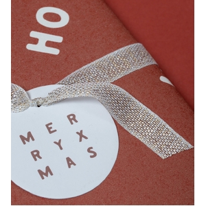 Quantity: 20 gift tags (4 kinds). Colours: mulled wine, chestnut, light grey, white. Finishes: foil. Stock: 350gsm white uncoated recycled paper. Tag sizes: Varied. Includes 300cm of brown kraft recycled paper string inside pack.
