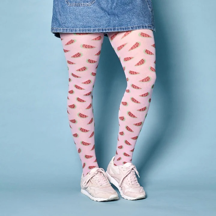Ladies' baby pink, opaque tights with juicy watermelon pattern.