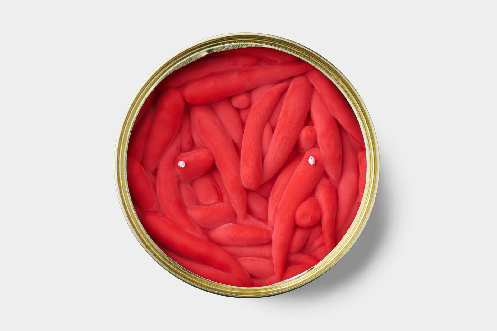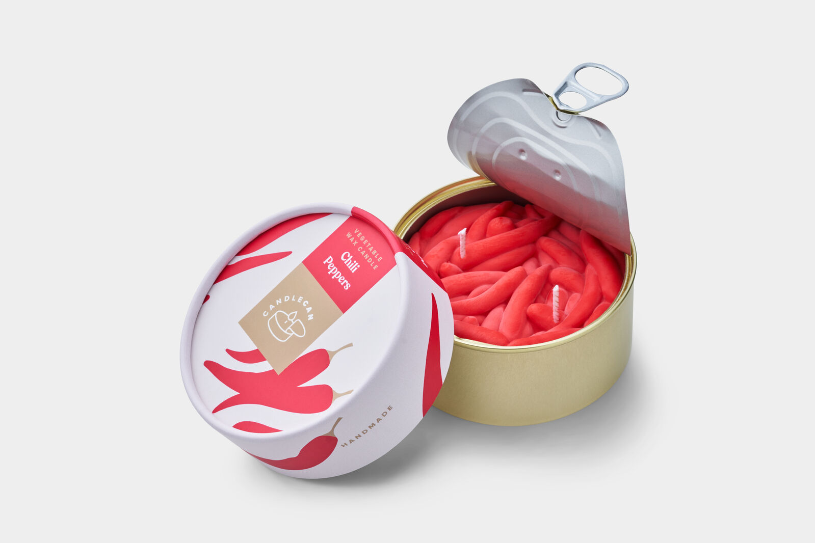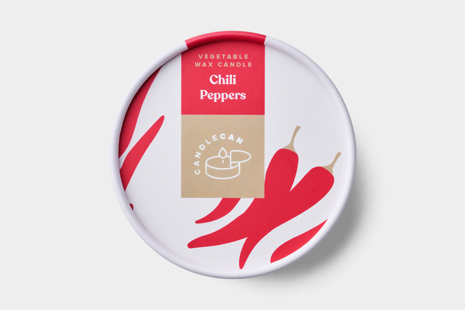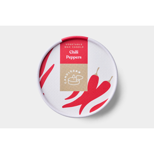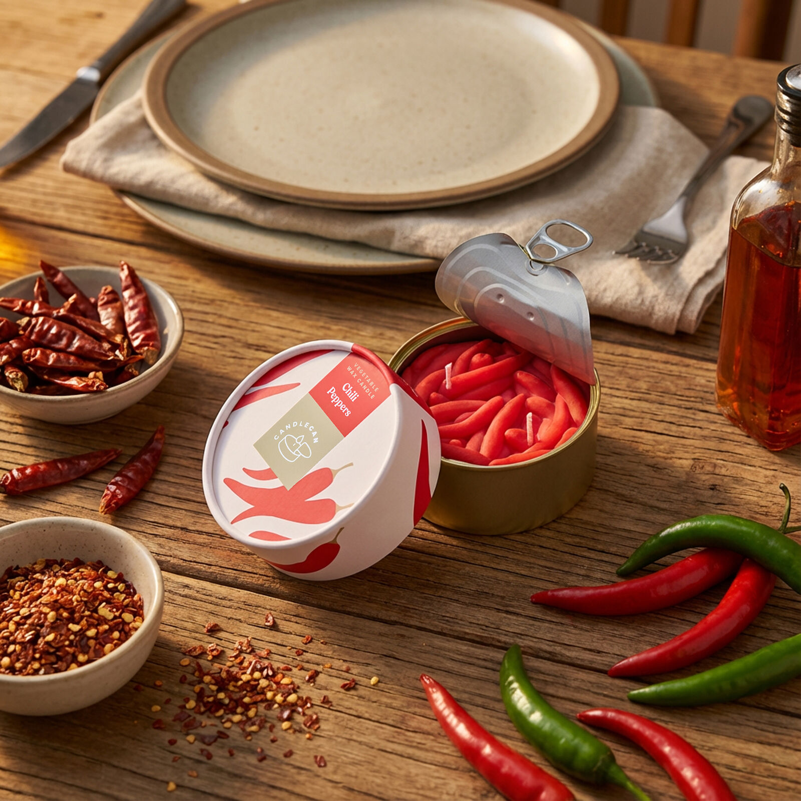 Hyper-realistic Chili Peppers candle sealed in a can like real food. Mimicking gourmet food it invites you for a playful sensory surprise. Once opened and lit, this handmade candle releases a sophisticated blend of soft pepper and warm woody notes, designed to uplift your space with a spicy, modern scents.