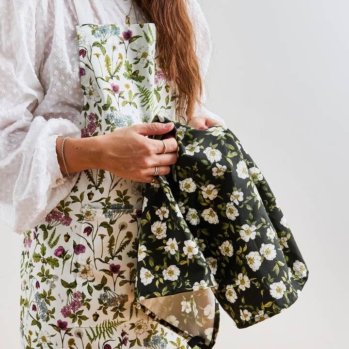 Luxury 'Cottage Garden' Tea Towel on an dark green base, 100% Organic Cotton.