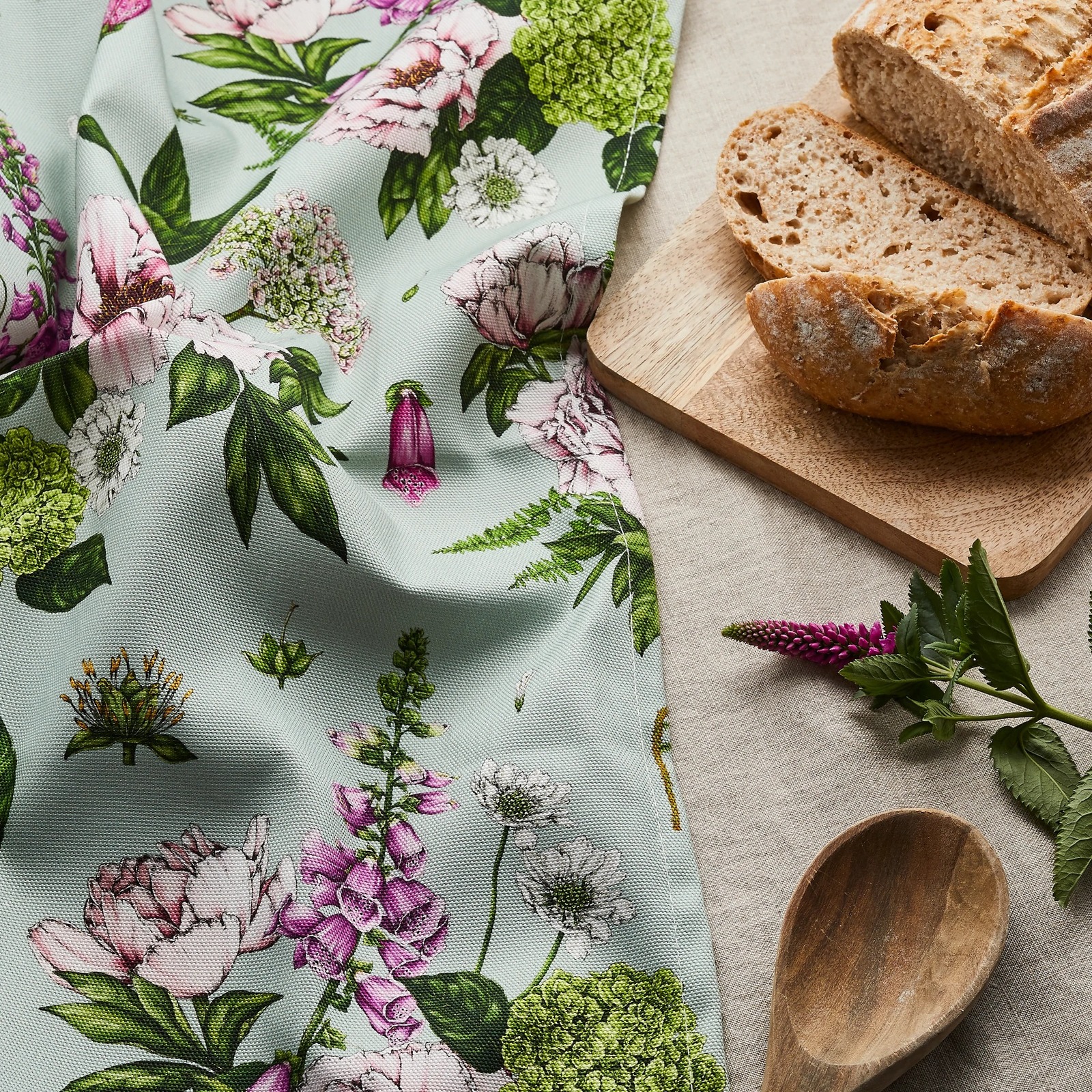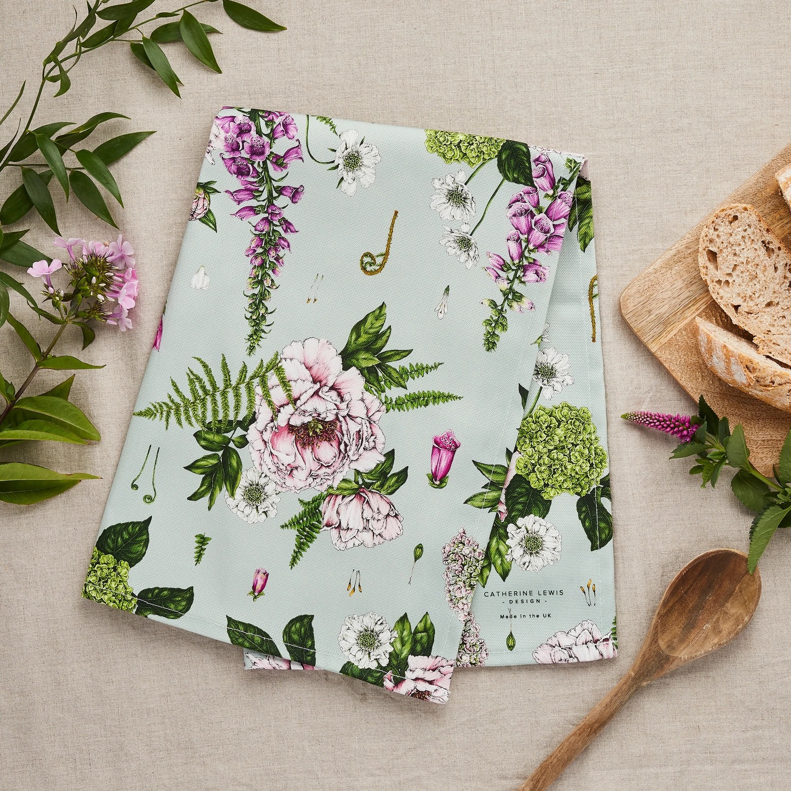 Intricately drawn Summer Garden design on an light greeen base. Printed on a high quality thick 100% Organic Cotton. This luxury tea towel is made to the highest standard and has a care label and brand tag.