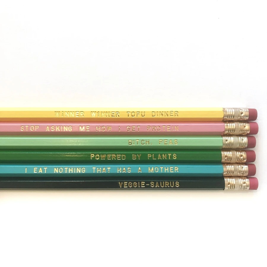 Pencils in the ‘Vegetarian’ pack are assorted colors and read: “winner winner tofu dinner” / “stop asking me how I get protein” / “bitch, peas” / “powered by plants” / “I eat nothing that has a mother” / “veggie-saurus”